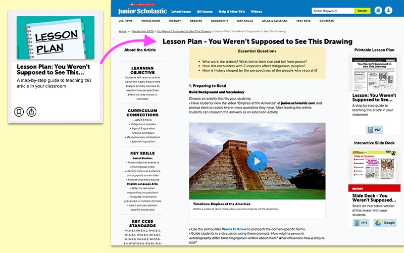 Every issue of Junior Scholastic comes with lesson plans for our feature articles. These lesson plans offer scaffolded instruction, pre-reading activities, discussion questions based on critical Social Studies and ELA skills, and extension activities that keep the learning going after students have read the article.