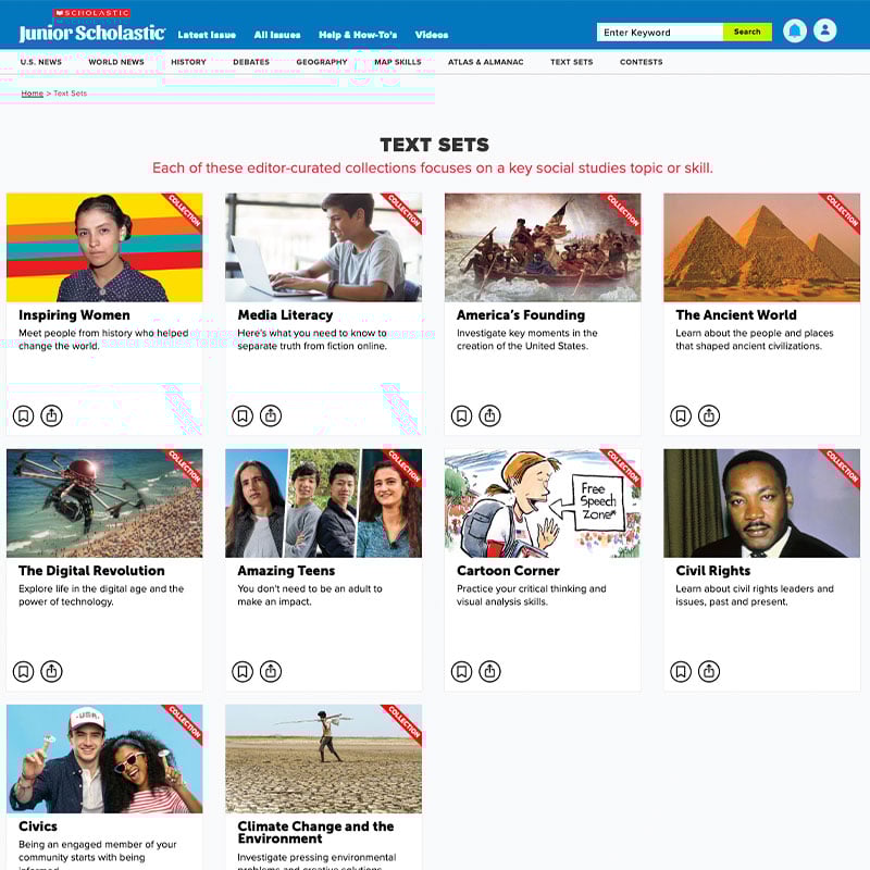 Text sets are collections of articles and videos curated by the editors of Junior Scholastic—plus graphic organizers, close-reading questions, and other teaching resources to help students compare texts and integrate information.